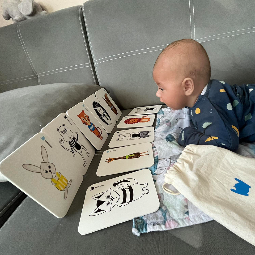 Всяка от стимулиращите карти е с цветна и с черно бяла страна. Черно бялата страна на картите се използва от 0 до 3 месеца, тъй като в този период децата виждат черно-бяло, премрежени силуети.